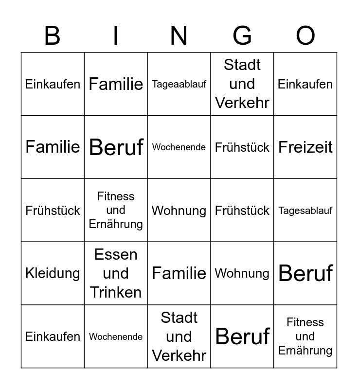 This bingo card has a free space and 24 words: Essen und Trinken, Wochenende, Wochenende, Einkaufen, Einkaufen, Einkaufen, Familie, Familie, Frühstück, Familie, Frühstück, Frühstück, Wohnung, Beruf, Beruf, Beruf, Tagesablauf, Tageaablauf, Freizeit, Fitness und Ernährung, Fitness und Ernährung, Kleidung, Stadt und Verkehr and Stadt und Verkehr.