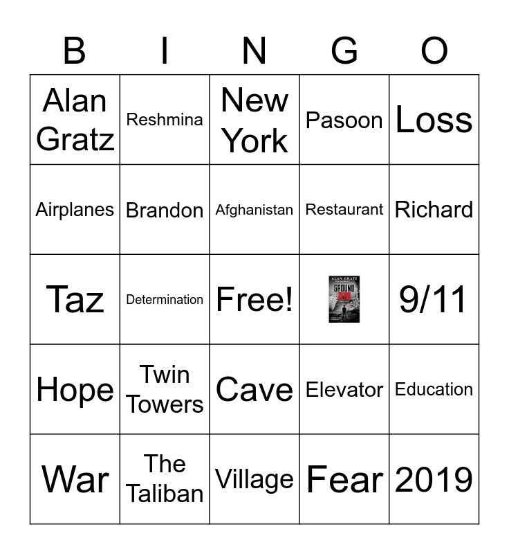 This bingo card has 1 images, a free space and 23 words: Twin Towers, The Taliban, Afghanistan, War, Loss, Alan Gratz, Airplanes, Reshmina, Cave, Restaurant, Taz, Elevator, Education, Brandon, Fear, 9/11, New York, Richard, Determination, 2019, Hope, Pasoon and Village.