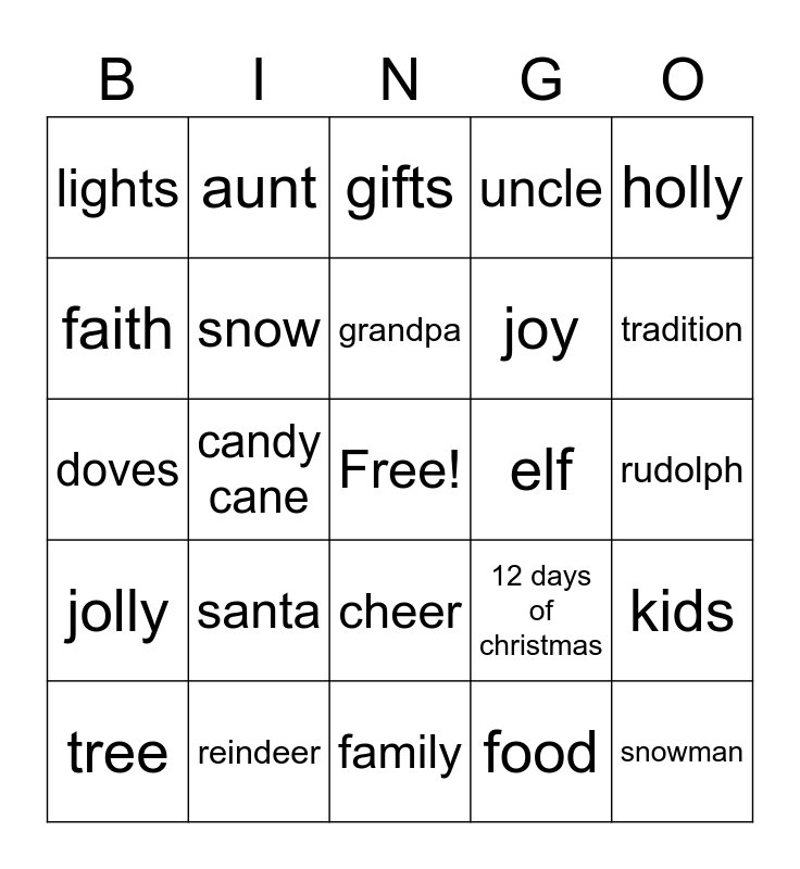 This bingo card has a free space and 29 words: tree, cookies, candy cane, wreath, lights, gifts, snow, santa, elf, reindeer, rudolph, snowman, family, food, tradition, friends, cheer, jolly, holly, doves, 12 days of christmas, giving, joy, faith, uncle, aunt, kids, grandpa and grandma.