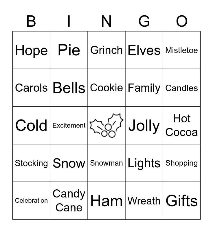 This bingo card has a free space and 48 words: Joy, Gifts, Turkey, Ham, Snow, Santa, Pie, Tree, Carols, Angel, Bells, Elves, Shopping, Lights, Merry, Decorations, Cookie, Jolly, Ribbon, Mistletoe, Excitement, Wreath, Hope, Family, Friends, Candles, Celebration, Sleigh, Snowman, Stocking, Toys, Frosty, Reindeer, Peppermint, Candy Cane, Eggnog, Ice Skates, Hot Cocoa, Decorate, Nutcracker, Gingerbread, Rudolph, Grinch, Winter, Cold, Desserts, North Pole and Holiday Sweater.