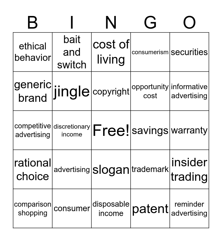 This bingo card has a free space and 24 words: advertising, consumer, copyright, comparison shopping, securities, ethical behavior, generic brand, bait and switch, savings, slogan, opportunity cost, competitive advertising, trademark, insider trading, jingle, patent, warranty, cost of living, informative advertising, discretionary income, reminder advertising, rational choice, consumerism and disposable income.