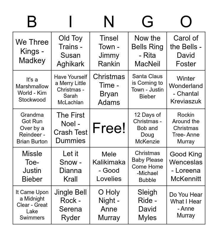 This bingo card has a free space and 39 words: Come Back this Christmas - Crystal Shawanda, Seven Joys of Mary - Great Big Sea, O Holy Night - The Canadian Tenors, Christmas Baby Please Come Home -Michael Bubble, Good King Wenceslas - Loreena McKennitt, Missle Toe- Justin Bieber, The First Noel - Crash Test Dummies, River - Joni Mitchell, 12 Days of Christmas - Bob and Doug McKenzie, Rockin Around the Christmas Tree- Anne Murray, It's a Marshmallow World - Kim Stockwood, Old Toy Trains - Susan Aghikark, Silent Night - Falynn Baptiste, Winter Wonderland - Chantal Kreviaszuk, Grandma Got Run Over by a Reindeer - Brian Burton, Let it Snow - Dianna Krall, Mele Kalikimaka - Good Lovelies, Now the Bells Ring - Rita MacNeil, The Huron Carol - Tom Jackson, It Came Upon a Midnight Clear - Great Lake Swimmers, Have Yourself a Merry Little Christmas - Sarah McLachlan, Christmas Time - Bryan Adams, Sleigh Ride - David Myles, Carol of the Bells - David Foster, I Saw Three Ships - Bruce Cockburn, Jingle Bell Rock - Serena Ryder, O Holy Night - Anne Murray, Have Yourself a Merry Little Christmas - Blue Rodeo, This Chrismas, I'm Coming Home - Wes Walls, We Three Kings - Madkey, I'll be Home for Christmas - Meghan Patrick, What Child is This - Paul Brandt, Santa Claus is Coming to Town - Justin Bieber, Do You Hear What I Hear - Anne Murray, Silent Night - Tyler Shaw, The Magic of Christmas Day - Celine Dion, Tinsel Town - Jimmy Rankin, Its the most Wonderful Time of the Year - Jann Arden and Snowmobile Song - Stompin' Tom Connors.