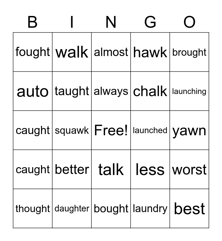 This bingo card has a free space and 34 words: autumn, laundry, drawn, awfully, caught, taught, brought, thought, walk, chalk, always, almost, crawled, crawling, launched, launching, daughter, caught, better, less, talk, most, fought, yawn, bought, best, hawk, taught, chalk, auto, least, squawk, worst and launch.