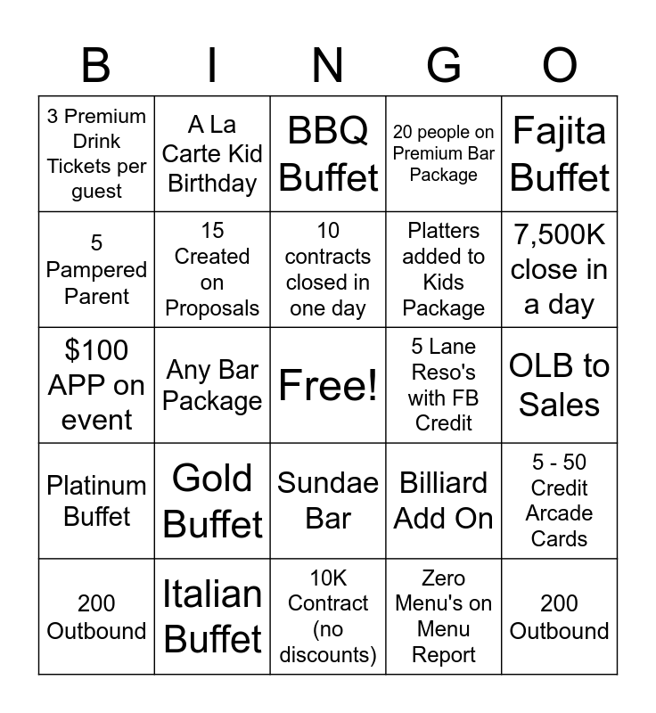 This bingo card has a free space and 24 words: 200 Outbound, Gold Buffet, 10 contracts closed in one day, Zero Menu's on Menu Report, Fajita Buffet, 3 Premium Drink Tickets per guest, A La Carte Kid Birthday, BBQ Buffet, 5 Lane Reso's with FB Credit, OLB to Sales, $100 APP on event, 15 Created on Proposals, Billiard Add On, 5 - 50 Credit Arcade Cards, 5 Pampered Parent, Italian Buffet, 10K Contract (no discounts), 20 people on Premium Bar Package, 7,500K close in a day, Platinum Buffet, Any Bar Package, Sundae Bar, Platters added to Kids Package and 200 Outbound.