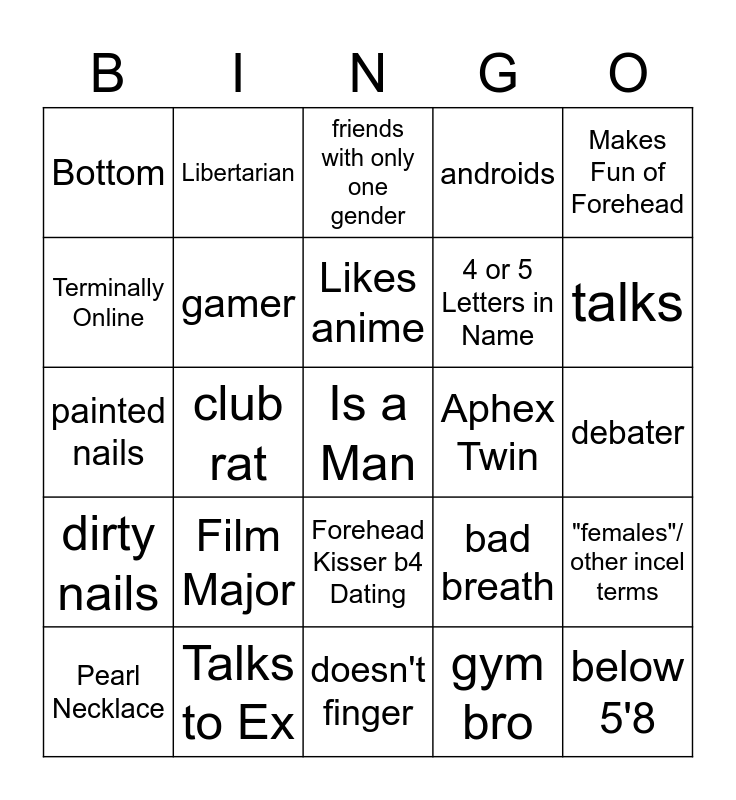 This bingo card has a free space and 24 words: Film Major, Talks to Ex, Likes anime, Pearl Necklace, Makes Fun of Forehead, Bottom, Terminally Online, Libertarian, Aphex Twin, Forehead Kisser b4 Dating, 4 or 5 Letters in Name, painted nails, bad breath, "females"/ other incel terms, gamer, gym bro, debater, friends with only one gender, talks, club rat, below 5'8, dirty nails, androids and doesn't finger.