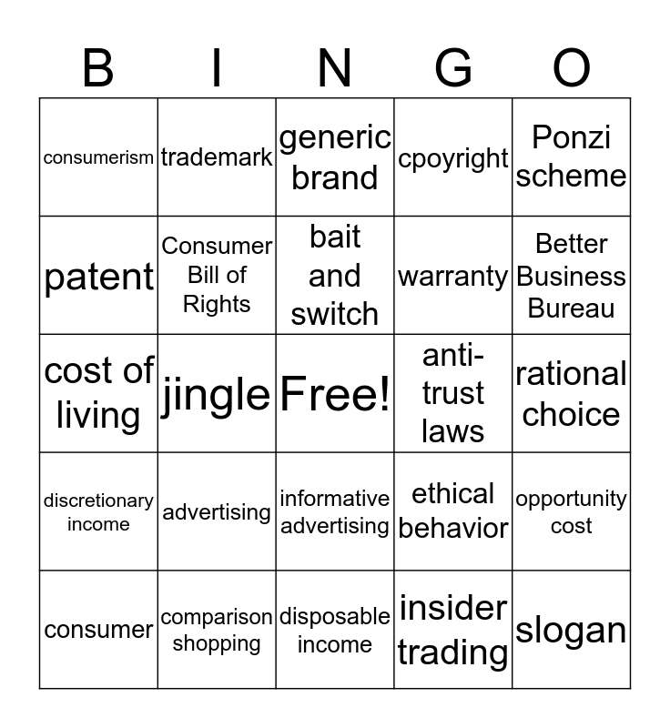 This bingo card has a free space and 24 words: advertising, comparison shopping, bait and switch, consumer, Ponzi scheme, consumerism, patent, trademark, anti-trust laws, informative advertising, warranty, cost of living, ethical behavior, opportunity cost, Consumer Bill of Rights, insider trading, rational choice, generic brand, Better Business Bureau, jingle, slogan, discretionary income, cpoyright and disposable income.