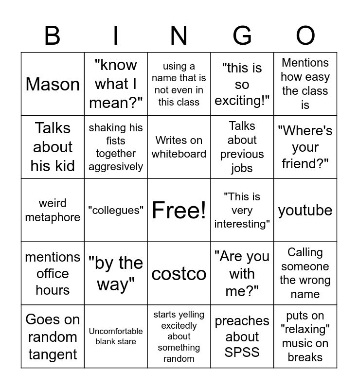 This bingo card has a free space and 24 words: "by the way", Uncomfortable blank stare, Writes on whiteboard, Goes on random tangent, Mentions how easy the class is, Mason, Talks about his kid, "know what I mean?", "This is very interesting", costco, Talks about previous jobs, weird metaphore, "Are you with me?", Calling someone the wrong name, shaking his fists together aggresively, preaches about SPSS, youtube, using a name that is not even in this class, "Where's your friend?", "collegues", puts on "relaxing" music on breaks, mentions office hours, "this is so exciting!" and starts yelling excitedly about something random.