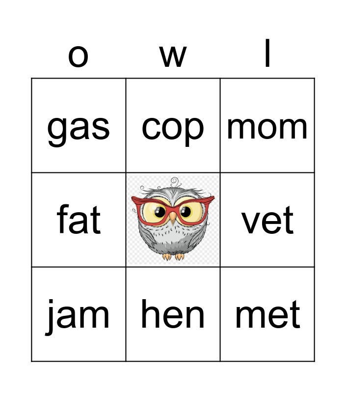 This bingo card has a free space and 23 words: pet, fig, hen, it, met, gas, vet, cop, did, mop, hip, fed, van, fan, hat, dog, mom, dad, jam, cat, fat, mat and man.