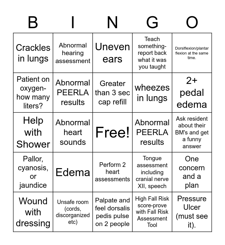 This bingo card has a free space and 24 words: Edema, Unsafe room (cords, discorganized etc), Greater than 3 sec cap refill, Wound with dressing, Dorsiflexion/plantar flexion at the same time., Crackles in lungs, Patient on oxygen-how many liters?, Abnormal hearing assessment, Abnormal PEERLA results, Perform 2 heart assessments, wheezes in lungs, Help with Shower, Tongue assessment including cranial nerve XII, speech, One concern and a plan, Abnormal PEERLA results, High Fall Risk score-prove with Fall Risk Assessment Tool, Ask resident about their BM's and get a funny answer, Uneven ears, 2+ pedal edema, Abnormal heart sounds, Pressure Ulcer (must see it)., Pallor, cyanosis, or jaundice, Teach something-report back what it was you taught and Palpate and feel dorsalis pedis pulse on 2 people.