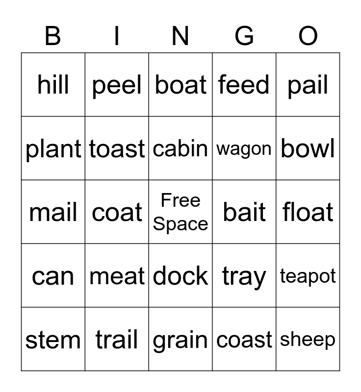This bingo card has a free space and 24 words: meat, trail, cabin, stem, pail, hill, plant, peel, bait, dock, wagon, mail, tray, teapot, toast, coast, float, boat, bowl, coat, sheep, can, feed and grain.