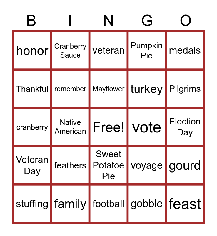 This bingo card has a free space and 29 words: dinner, family, veteran, Thanksgiving, medals, honor, remember, Mayflower, vote, gourd, stuffing, Native American, gobble, feast, cranberry, cornucopia, football, voyage, Pilgrims, Veteran Day, feathers, thanks, turkey, Election Day, Thankful, Cranberry Sauce, Sweet Potatoe Pie, Pumpkin Pie and Icecream.