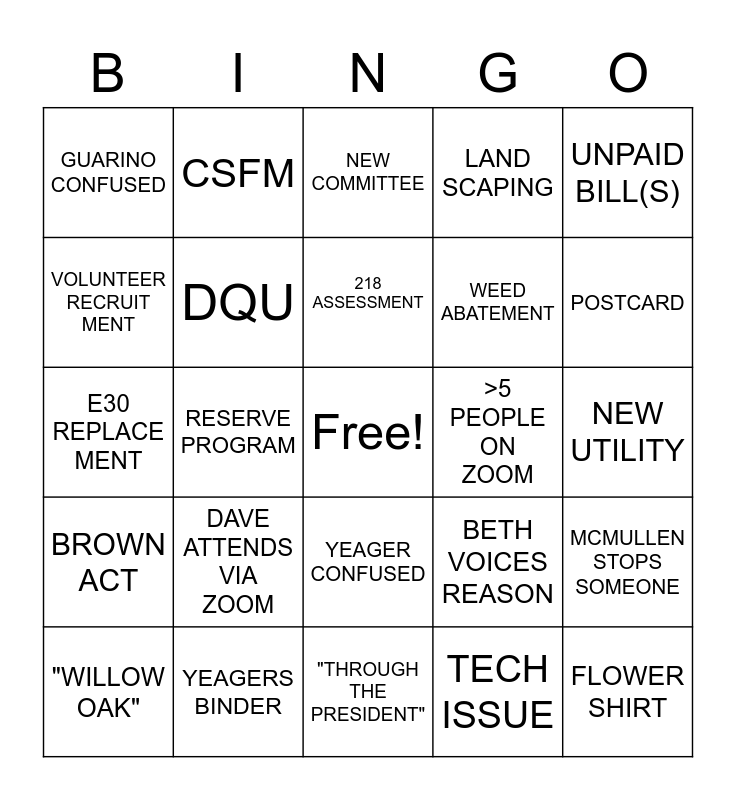 This bingo card has a free space and 24 words: DAVE ATTENDS VIA ZOOM, YEAGERS BINDER, 218 ASSESSMENT, "WILLOW OAK", UNPAID BILL(S), GUARINO CONFUSED, VOLUNTEER RECRUIT MENT, CSFM, >5 PEOPLE ON ZOOM, YEAGER CONFUSED, WEED ABATEMENT, E30 REPLACE MENT, BETH VOICES REASON, MCMULLEN STOPS SOMEONE, DQU, TECH ISSUE, NEW UTILITY, NEW COMMITTEE, POSTCARD, RESERVE PROGRAM, FLOWER SHIRT, BROWN ACT, LAND SCAPING and "THROUGH THE PRESIDENT".