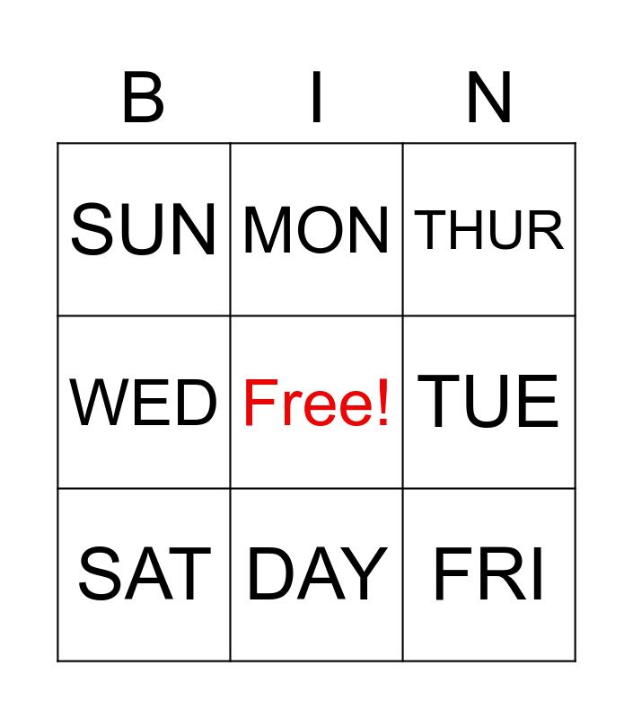 This bingo card has a free space and 8 words: TUE, THUR, MON, SAT, SUN, FRI, WED and DAY.