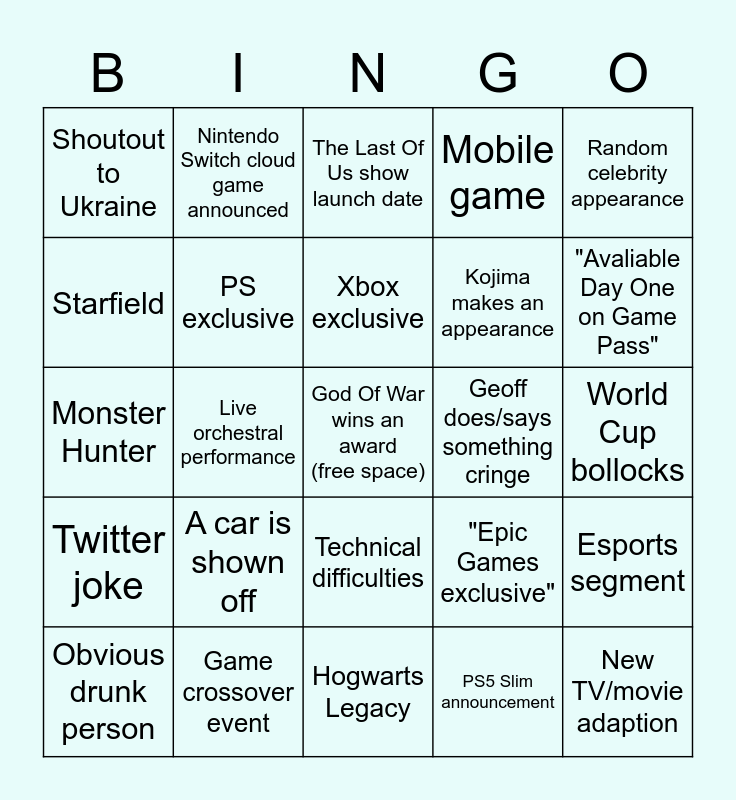 This bingo card has a free space and 69 words: "High fidelity", World Cup bollocks, Doug Bowser appears, No new FFVIIR news, Game crossover event, Wolf Among Us 2, Mobile game, Indie game showreel, Random celebrity appearance, Dead Space, Esports segment, Dino Crisis Remaster, Shoutout to Ukraine, The Last Of Us show launch date, FFXIV release date, Live orchestral performance, Technical difficulties, Kojima makes an appearance, "Avaliable to play TONIGHT!", Twitter joke, Geoff does/says something cringe, "Epic Games exclusive", "Avaliable Day One on Game Pass", Todd Howard appears, PSVR2 plug, "For gamers", AMD segment, TLOU Part II, PS5 Slim announcement, Something added to Nintendo Switch Online, Nintendo Switch cloud game announced, KH4, Mario movie, Cosplayers, Fortnite, Overwatch 2, Sponsor, Genshin Impact, Starfield, Someone swears, A car is shown off, New TV/movie adaption, Pokemon ScarVi DLC, Ubisoft, EA, Obvious drunk person, "Cutting edge", 60 FPS, Persona 6, PS exclusive, Xbox exclusive, Aisha Tyler, Covid/pandemic is mentioned, Hogwarts Legacy, Marvel game, Unexpected sequel, Silent Hill, GTA 6, New DMC game, Monster Hunter, Bloodbourne 2, Someone is speaking a different language, Mass Effect, Dreamlight Valley, Grounded, Ghosts of Tsushima 2, Sims 5, Elder Scrolls VI and New Xbox Model.
