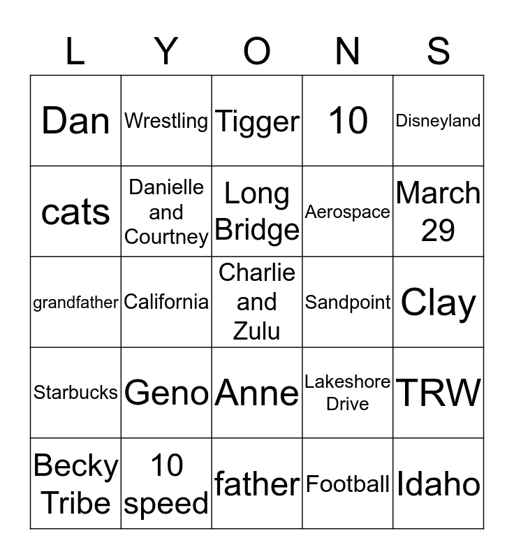 This bingo card has 38 words: softball, bulldogs, middle child, Danielle and Courtney, TRW, Geno, Long Bridge, San Pedro, Disneyland, Aerospace, California, 10, Charlie and Zulu, Clay, cats, Starbucks, Jason, Tigger, June 14, Sandpoint, Dan, 10 speed, March 29, Becky Tribe, 35, father, Idaho, Kent, Marc, science fiction, Fish Hatchery Road, Anne, Football, Wrestling, friends, Lakeshore Drive, grandfather and Arizona.