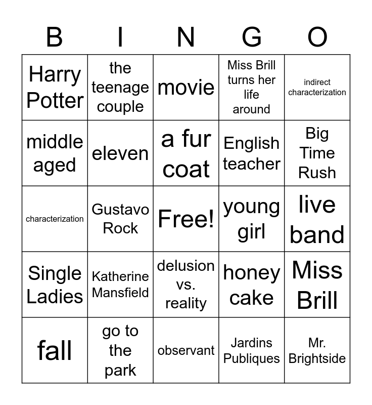 This bingo card has a free space and 24 words: Katherine Mansfield, go to the park, a fur coat, fall, indirect characterization, Harry Potter, middle aged, the teenage couple, young girl, delusion vs. reality, English teacher, characterization, honey cake, Miss Brill, eleven, Jardins Publiques, live band, movie, Big Time Rush, Gustavo Rock, Mr. Brightside, Single Ladies, Miss Brill turns her life around and observant.