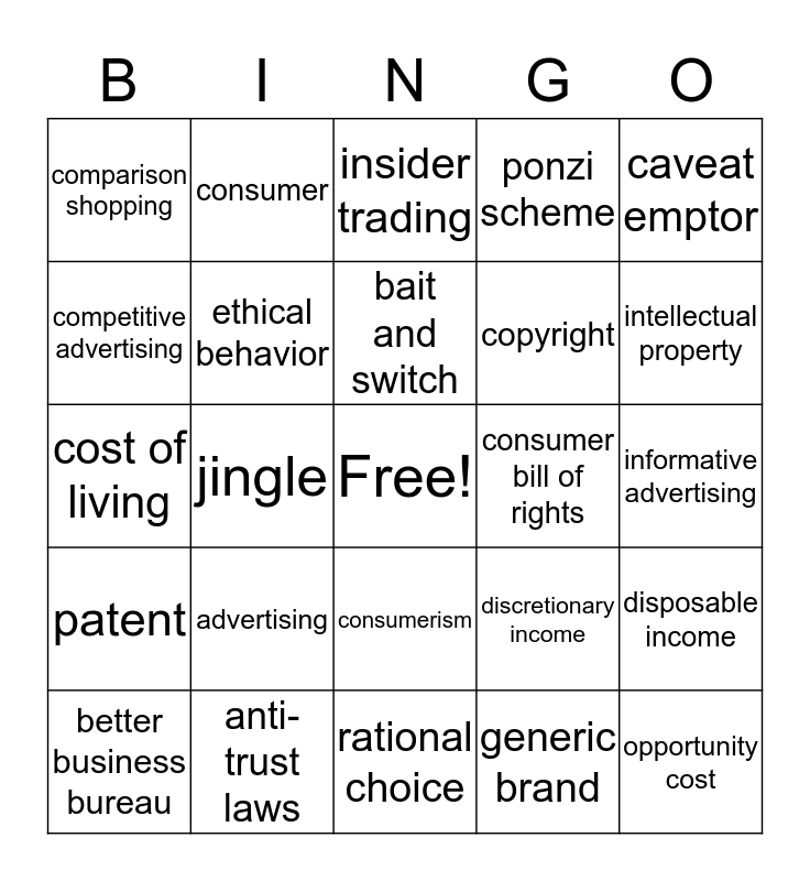 This bingo card has a free space and 24 words: advertising, anti-trust laws, bait and switch, better business bureau, caveat emptor, comparison shopping, competitive advertising, consumer, consumer bill of rights, consumerism, copyright, cost of living, discretionary income, disposable income, ethical behavior, generic brand, informative advertising, insider trading, intellectual property, jingle, opportunity cost, patent, ponzi scheme and rational choice.
