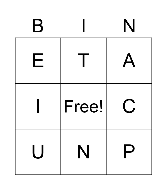 This bingo card has a free space and 8 words: C, A, T, U, E, P, I and N.