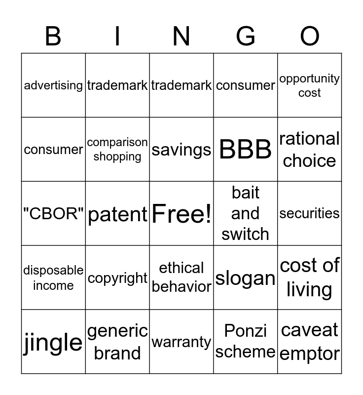 This bingo card has a free space and 24 words: copyright, generic brand, savings, jingle, opportunity cost, advertising, consumer, trademark, bait and switch, ethical behavior, BBB, "CBOR", slogan, cost of living, comparison shopping, Ponzi scheme, securities, trademark, rational choice, patent, caveat emptor, disposable income, consumer and warranty.