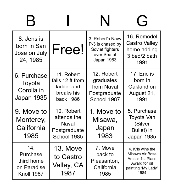This bingo card has 1 images and 18 words: 1. Move to Misawa, Japan 1983, 2. Give 1969 Blue Plymouth Satellite to Brenda 1983, 3. Robert’s Navy P-3 is chased by Soviet fighters over Sea of Japan 1983, 4. Kris wins the Misawa Air Base Artist’s 1st Place Award for oil painting “My Lady” 1984, 5. Purchase Toyota Van (Silver Bullet) in Japan 1985, 6. Purchase Toyota Corolla in Japan 1985, 7. Move back to Pleasanton, California 1985, 8. Jens is born in San Jose on July 24, 1985, Free!, 9. Move to Monterey, California 1985, 10. Robert attends the Naval Postgraduate School 1985, 11. Robert falls 12 ft from ladder and breaks his back 1986, 12. Robert graduates from Naval Postgraduate School 1987, 13. Move to Castro Valley, CA 1987, 14. Purchase third home on Paradise Knoll 1987, 15. Robert goes to work in Alameda, California 1987, 16. Remodel Castro Valley home adding 3 bed/2 bath 1991 and 17. Eric is born in Oakland on August 21, 1991.