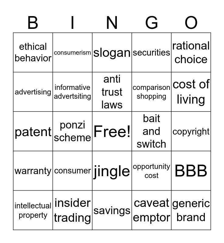 This bingo card has a free space and 24 words: consumer, insider trading, anti trust laws, intellectual property, rational choice, ethical behavior, advertising, consumerism, bait and switch, jingle, comparison shopping, patent, opportunity cost, BBB, informative advertsiting, caveat emptor, copyright, slogan, cost of living, ponzi scheme, generic brand, warranty, securities and savings.