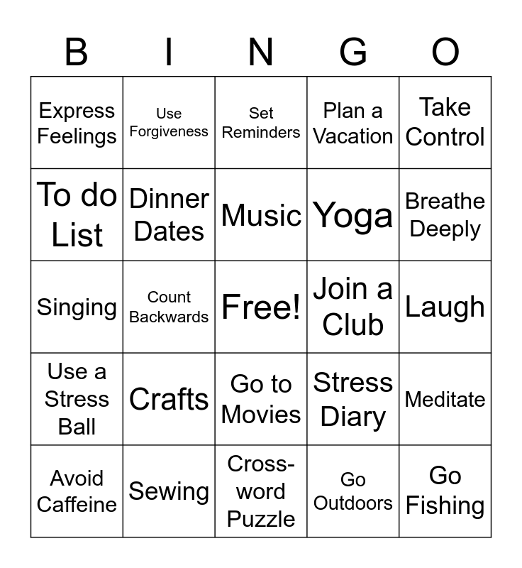 This bingo card has a free space and 24 words: Crafts, Sewing, Music, Avoid Caffeine, Take Control, Express Feelings, To do List, Use Forgiveness, Join a Club, Go to Movies, Yoga, Singing, Stress Diary, Meditate, Dinner Dates, Go Outdoors, Laugh, Set Reminders, Breathe Deeply, Count Backwards, Go Fishing, Use a Stress Ball, Plan a Vacation and Cross-word Puzzle.