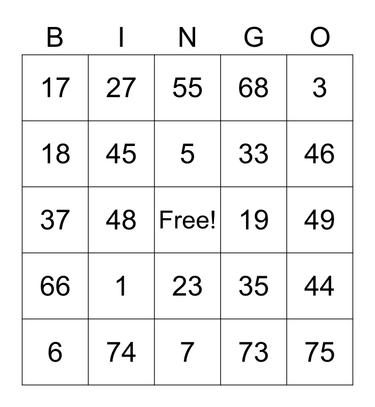 This bingo card has a free space and 25 words: 1, 7, 5, 6, 3, 17, 18, 27, 19, 23, 33, 37, 35, 44, 45, 54, 49, 55, 46, 48, 75, 74, 66, 68 and 73.