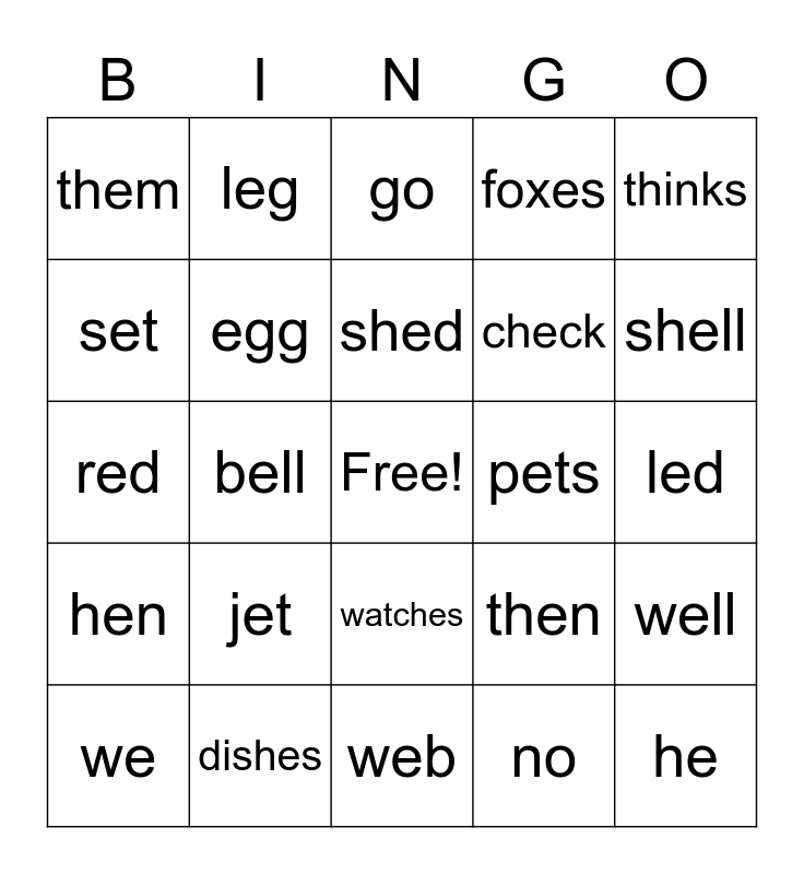 This bingo card has a free space and 45 words: me, he, she, we, I, no, go, so, thinks, dishes, foxes, pets, watches, jet, men, web, let, red, yes, shell, leg, yell, mess, them, chess, led, when, wet, then, hen, bed, well, fed, fell, ten, bell, pet, less, beg, shed, set, check, deck, egg and net.