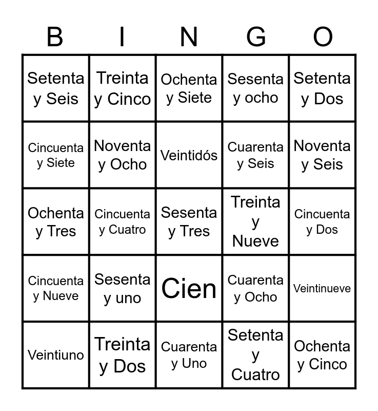 This bingo card has 30 words: Treinta y Dos, Cuarenta y Tres, Cincuenta y Cuatro, Sesenta y Cinco, Setenta y Seis, Ochenta y Siete, Noventa y Ocho, Cien, Treinta y Nueve, Cuarenta y Uno, Cincuenta y Dos, Sesenta y Tres, Setenta y Cuatro, Ochenta y Cinco, Noventa y Seis, Treinta y Siete, Cuarenta y Ocho, Cincuenta y Nueve, Sesenta y uno, Setenta y Dos, Ochenta y Tres, Noventa y Cuatro, Treinta y Cinco, Cuarenta y Seis, Cincuenta y Siete, Sesenta y ocho, Veintinueve, Veintiuno, Veintidós and Veinticinco.