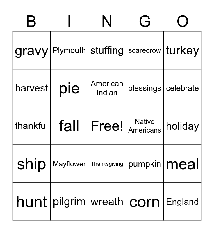 This bingo card has a free space and 24 words: Mayflower, pilgrim, American Indian, hunt, turkey, gravy, harvest, Plymouth, Native Americans, Thanksgiving, blessings, thankful, pumpkin, meal, pie, corn, holiday, stuffing, celebrate, fall, England, ship, scarecrow and wreath.