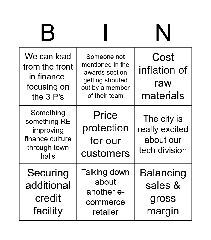 This bingo card has 12 words: Reach out to a member of the finance vision committee, Balancing sales & gross margin, Price protection for our customers, The city is really excited about our tech division, Someone not mentioned in the awards section getting shouted out by a member of their team, Cost inflation of raw materials, Talking down about another e-commerce retailer, You know who asking a question, We can lead from the front in finance, focusing on the 3 P's, Something something RE improving finance culture through town halls, Securing additional credit facility and Beauty simplification is progressing on schedule.
