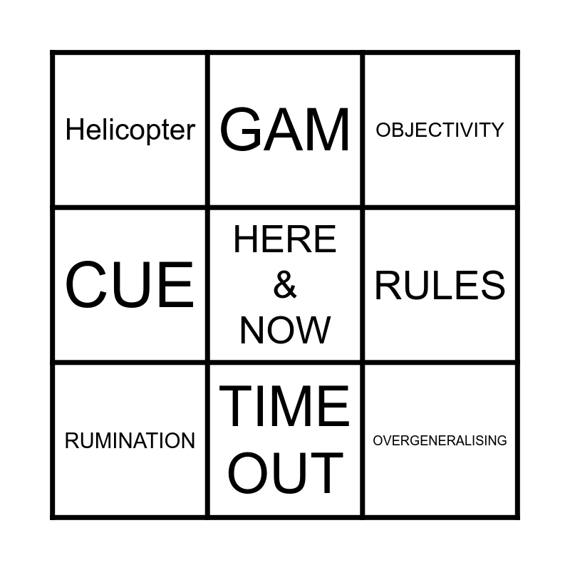This bingo card has 9 words: RUMINATION, OBJECTIVITY, GAM, CUE, Helicopter, RULES, HERE & NOW, OVERGENERALISING and TIME OUT.