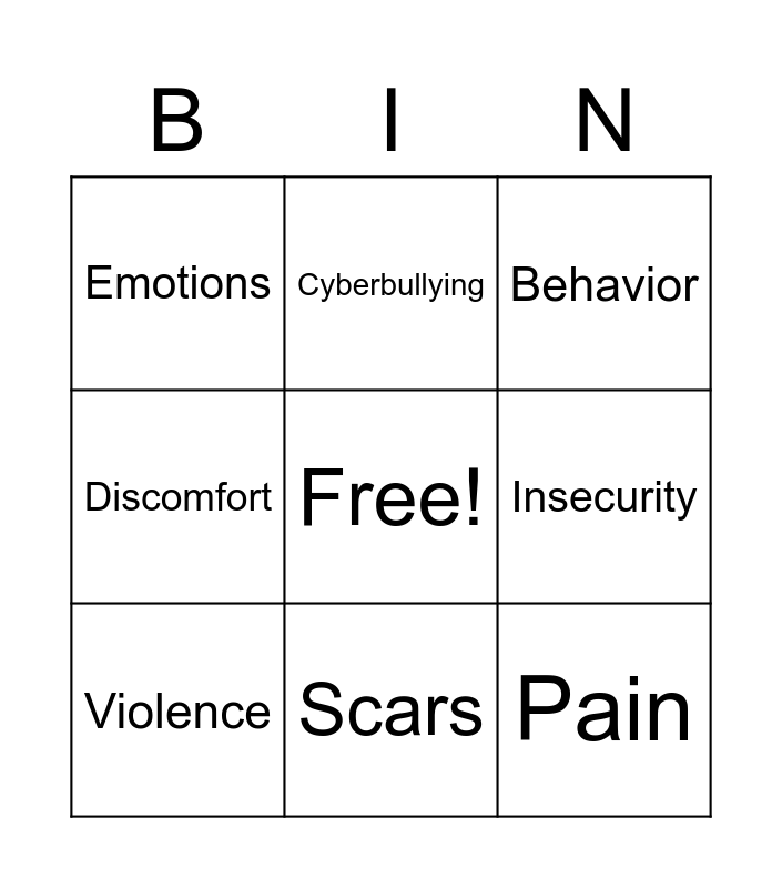 This bingo card has a free space and 15 words: Bullying, Abuse, Behavior, Emotions, Scars, Pain, Suicide, Trauma, Insecurity, Intimidation, Injury, Discomfort, Violence, Cyberbullying and Harassment.