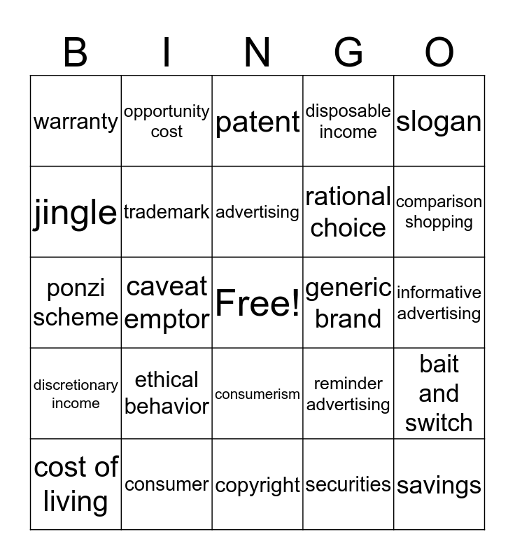 This bingo card has a free space and 24 words: ethical behavior, consumer, advertising, cost of living, slogan, warranty, jingle, opportunity cost, generic brand, consumerism, rational choice, ponzi scheme, reminder advertising, bait and switch, trademark, securities, informative advertising, patent, comparison shopping, caveat emptor, savings, discretionary income, disposable income and copyright.