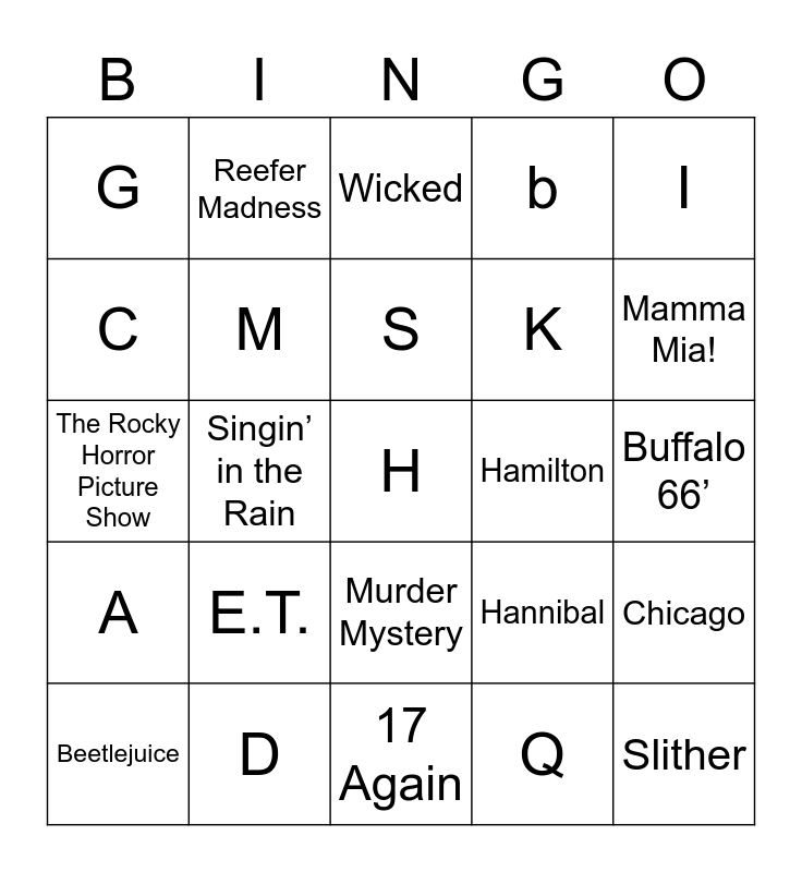 This bingo card has 60 words: W, D, X, A, Q, O, M, J, K, V, b, Z, C, E, F, G, H, I, L, S, Hamilton, Wicked, Beetlejuice, Chicago, Kinky Boots, Cats, Hairspray, Rent, Mamma Mia!, Waitress, Mean Girls, Les Miserables, The Producers, Little Shop of Horrors, Reefer Madness, Grease, The Addams Family, Singin’ in the Rain, Newsies, The Rocky Horror Picture Show, Heathers, E.T., Buffalo 66’, Ghost World, Hannibal, Eternal Sunshine of the Spotless Mind, Brain Damage, Fargo, Sideways, Murder Mystery, 17 Again, Greasy Strangler, Don’t Tell Mom the Babysitter’s Dead, Interview with a Vampire, Adaptation, The Shining, Little Women, National Lampoon Vacation, Slither and Failure to Launch.