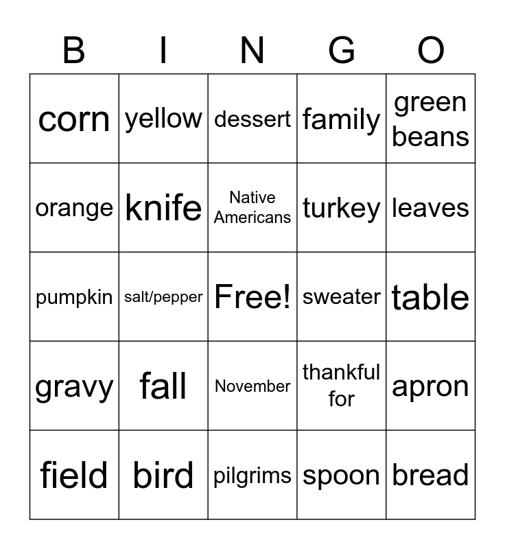 This bingo card has a free space and 24 words: fall, bird, Native Americans, field, green beans, corn, orange, yellow, sweater, November, turkey, pumpkin, thankful for, apron, knife, spoon, table, dessert, leaves, salt/pepper, bread, gravy, family and pilgrims.