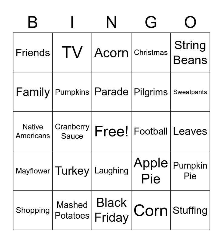 This bingo card has a free space and 24 words: Turkey, Mashed Potatoes, Parade, Shopping, String Beans, Friends, Family, TV, Football, Laughing, Pilgrims, Native Americans, Apple Pie, Pumpkin Pie, Pumpkins, Corn, Leaves, Acorn, Sweatpants, Cranberry Sauce, Stuffing, Mayflower, Christmas and Black Friday.