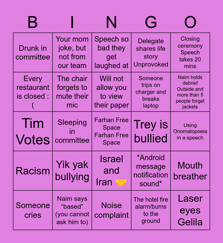 This bingo card has a free space and 29 words: Someone cries, No Deodorant??!!, Sleeping in committee, I rack I ran Nigh Jer, Drunk in committee, Speech so bad they get laughed at, The chair forgets to mute their mic, Yik yak bullying, Trey is bullied, Naim says “based” (you cannot ask him to), Using Onomatopoeia in a speech, Laser eyes Gelila, Noise complaint, The hotel fire alarm/burns to the ground, Naim holds debrief Outside and more than 5 people forget jackets, Russia gets Called out for current events, Israel and Iran 🤝, Racism, Closing ceremony Speech takes 20 mins, Tim Votes, *Android message notification sound*, Point of order but they’re wrong (IDIOT!), Someone trips on charger and breaks laptop, Every restaurant is closed :(, Delegate shares life story Unprovoked, Your mom joke, but not from our team, Mouth breather, Will not allow you to view their paper and Left a tab open from last night 😳.