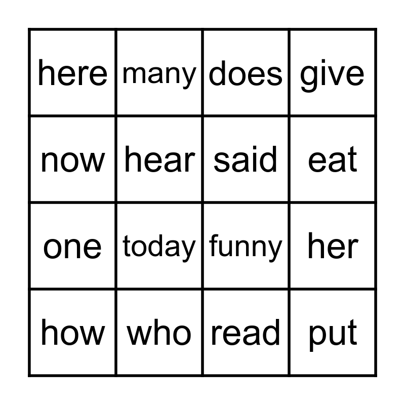 This bingo card has 16 words: who, her, does, here, one, many, funny, read, now, hear, how, give, today, eat, said and put.