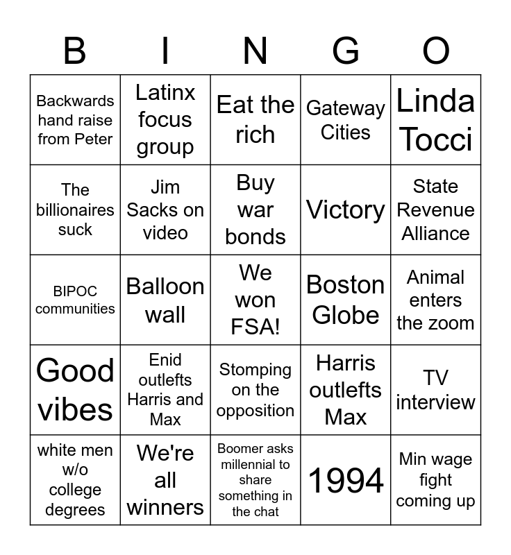This bingo card has a free space and 31 words: Boomer asks millennial to share something in the chat, Child enters the zoom, Balloon wall, Tax the rich, Backwards hand raise from Peter, Eat the rich, Jim Sacks on video, Harris outlefts Max, Boston Globe, 1994, Animal enters the zoom, Min wage fight coming up, Max outlefts Harris, Obscure reference from Phineas, State Revenue Alliance, Cranberry farmer, TV interview, Enid outlefts Harris and Max, Good vibes, Stomping on the opposition, Linda Tocci, white women w/o college degrees, white men w/o college degrees, Latinx focus group, Victory, The billionaires suck, Gateway Cities, BIPOC communities, We're all winners, Buy war bonds and Hilarious Lew Finfer zoom angle.