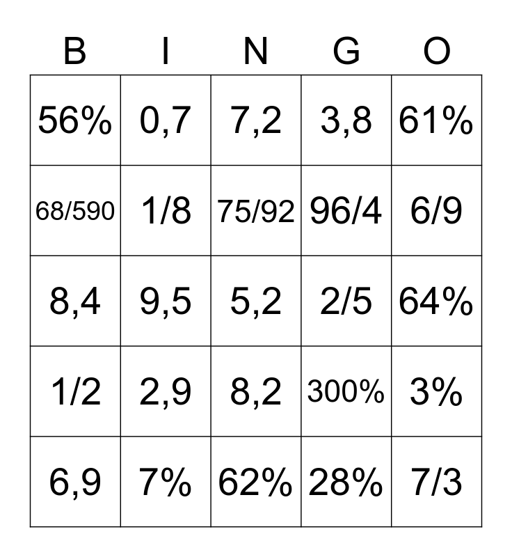 This bingo card has 25 words: 2,9, 62%, 75/92, 6,9, 61%, 56%, 68/590, 0,7, 2/5, 8,2, 96/4, 8,4, 300%, 3%, 1/8, 7/3, 64%, 7,2, 6/9, 9,5, 5,2, 7%, 1/2, 3,8 and 28%.