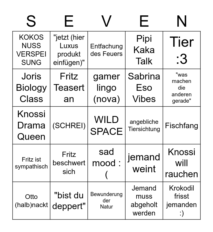 This bingo card has a free space and 24 words: Fritz beschwert sich, "bist du deppert", gamer lingo (nova), Otto (halb)nackt, Tier :3, KOKOS NUSS VERSPEI SUNG, Joris Biology Class, "jetzt (hier Luxus produkt einfügen)", angebliche Tiersichtung, sad mood :(, Sabrina Eso Vibes, Knossi Drama Queen, jemand weint, Knossi will rauchen, Fritz Teasert an, Jemand muss abgeholt werden, Fischfang, Entfachung des Feuers, "was machen die anderen gerade", (SCHREI), Krokodil frisst jemanden :), Fritz ist sympathisch, Pipi Kaka Talk and Bewunderung der Natur.