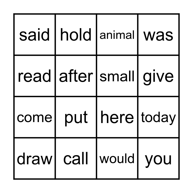 This bingo card has 16 words: call, today, animal, said, come, hold, here, would, read, after, draw, was, put, give, small and you.