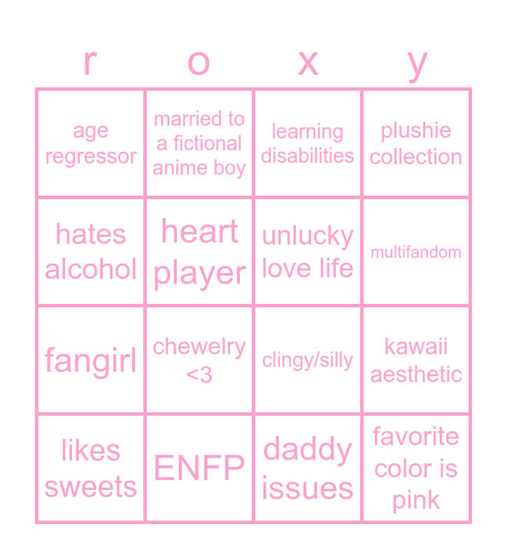 This bingo card has 16 words: ENFP, kawaii aesthetic, learning disabilities, age regressor, fangirl, married to a fictional anime boy, clingy/silly, daddy issues, hates alcohol, heart player, likes sweets, plushie collection, chewelry <3, multifandom, unlucky love life and favorite color is pink.