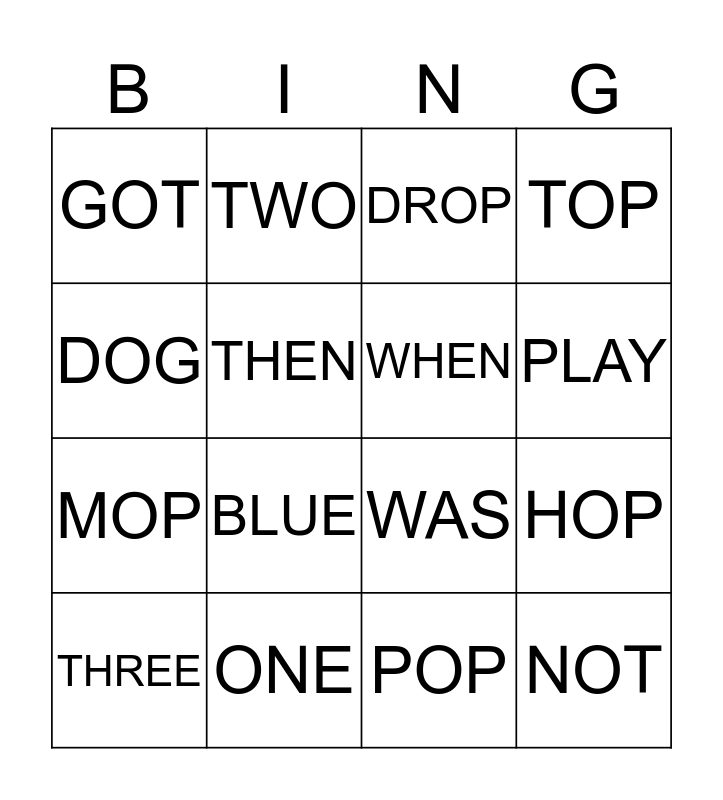 This bingo card has 16 words: ONE, HOP, DROP, GOT, MOP, TWO, WAS, POP, DOG, THEN, THREE, TOP, BLUE, PLAY, WHEN and NOT.