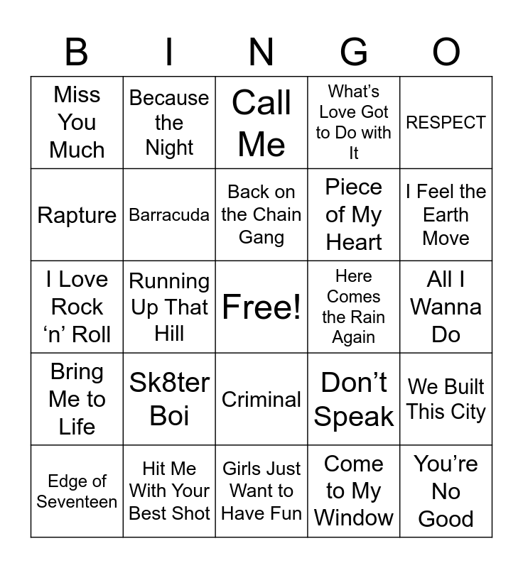 This bingo card has a free space and 31 words: Girls Just Want to Have Fun, Total Eclipse of the Heart, Running Up That Hill, Fast Car, Miss You Much, Call Me, Barracuda, Don’t Speak, Here Comes the Rain Again, Come to My Window, All I Wanna Do, You’re No Good, Kiss Me Deadly, You’re So Vain, I Feel the Earth Move, Like a Virgin, We Built This City, Sk8ter Boi, Bring Me to Life, Criminal, RESPECT, So What, Edge of Seventeen, Because the Night, Piece of My Heart, Rapture, What’s Love Got to Do with It, I Love Rock ‘n’ Roll, Hit Me With Your Best Shot, Back on the Chain Gang and Ironic.