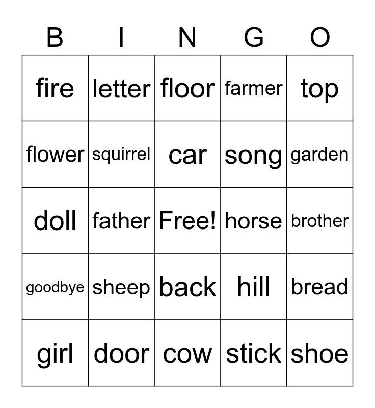 This bingo card has a free space and 89 words: apple, baby, back, ball, bear, bed, bell, bird, birthday, boat, box, boy, bread, brother, cake, car, chair, chicken, children, Christmas, coat, corn, cow, dog, doll, door, duck, egg, eye, farm, farmer, father, feet, fire, fish, floor, flower, game, garden, girl, goodbye, grass, hand, head, hill, horse, house, kitty, leg, letter, man, men, milk, money, mother, name, nest, night, paper, party, picture, pig, rabbit, rain, ring, robin, Santa Claus, school, seed, sheep, shoe, sister, snow, song, squirrel, stick, street, sun, table, time, top, toy, tree, watch, water, way, wind, window and wood.