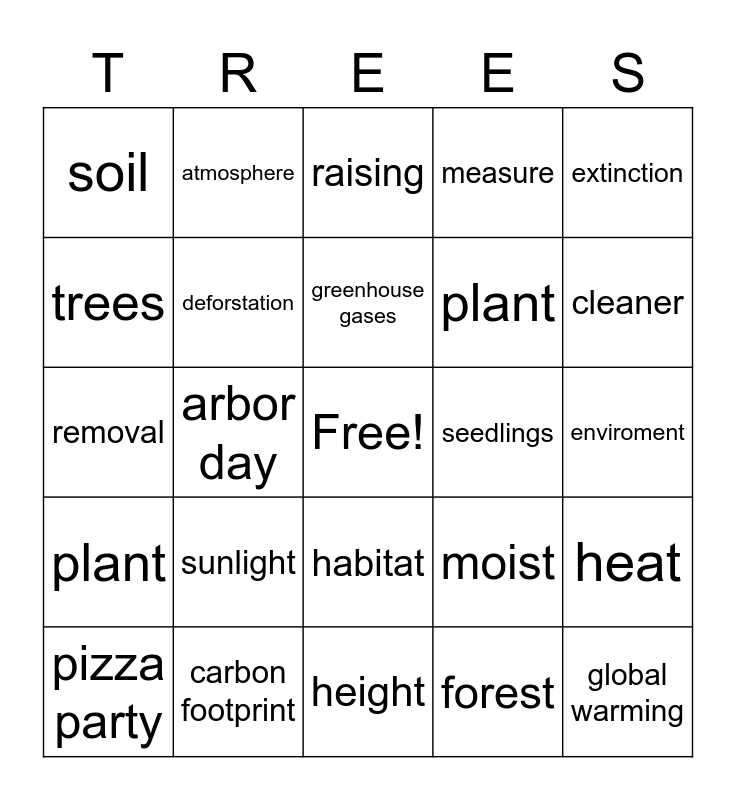 This bingo card has a free space and 24 words: sunlight, carbon footprint, greenhouse gases, pizza party, extinction, soil, trees, atmosphere, seedlings, habitat, plant, removal, moist, heat, deforstation, forest, enviroment, raising, cleaner, arbor day, global warming, plant, measure and height.