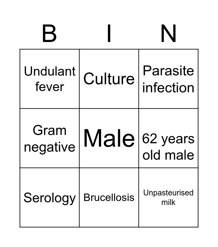 This bingo card has 16 words: Meningitis, Intracellular bacteria, 62 years old male, Undulant fever, Brucellosis, Parasite infection, Doxycycline + Rifampicin, Culture, Unpasteurised milk, Gram negative, Farmers, Culture, 62 year old, Serology, Male and Intracellular bacteria.