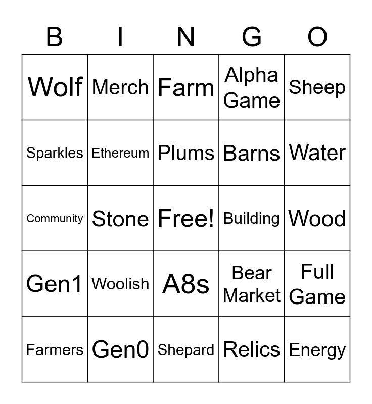 This bingo card has a free space and 25 words: Woolish, Shepard, Plums, Farmers, Sheep, Wolf, Sparkles, Merch, Building, A8s, Barns, Community, Bear Market, Full Game, Ethereum, Resources, Wood, Farm, Water, Stone, Energy, Gen0, Gen1, Alpha Game and Relics.